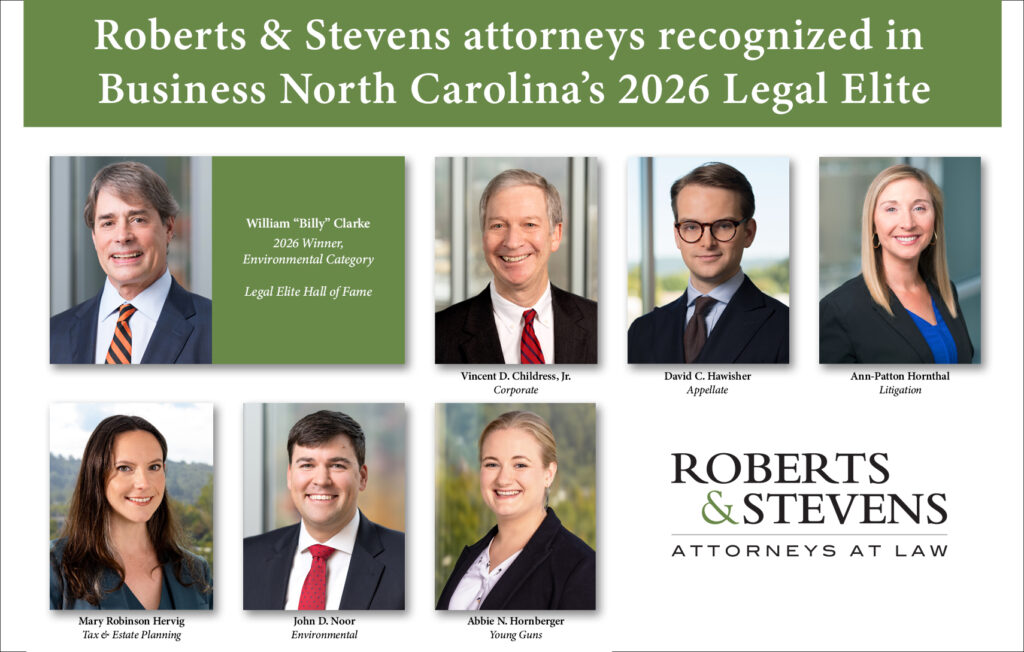 Roberts & Stevens is pleased to announce that seven of the firm’s attorneys have been selected by their peers for inclusion in the 2026 Business North Carolina Legal Elite, a listing of the state’s best attorneys in their fields. The attorneys recognized by this year’s annual publication are: William Clarke, Vincent D. Childress, Jr., David C. Hawisher, Ann-Patton Hornthal, Mary Robinson Hervig, John D. Noor and Abbie N. Hornberger.